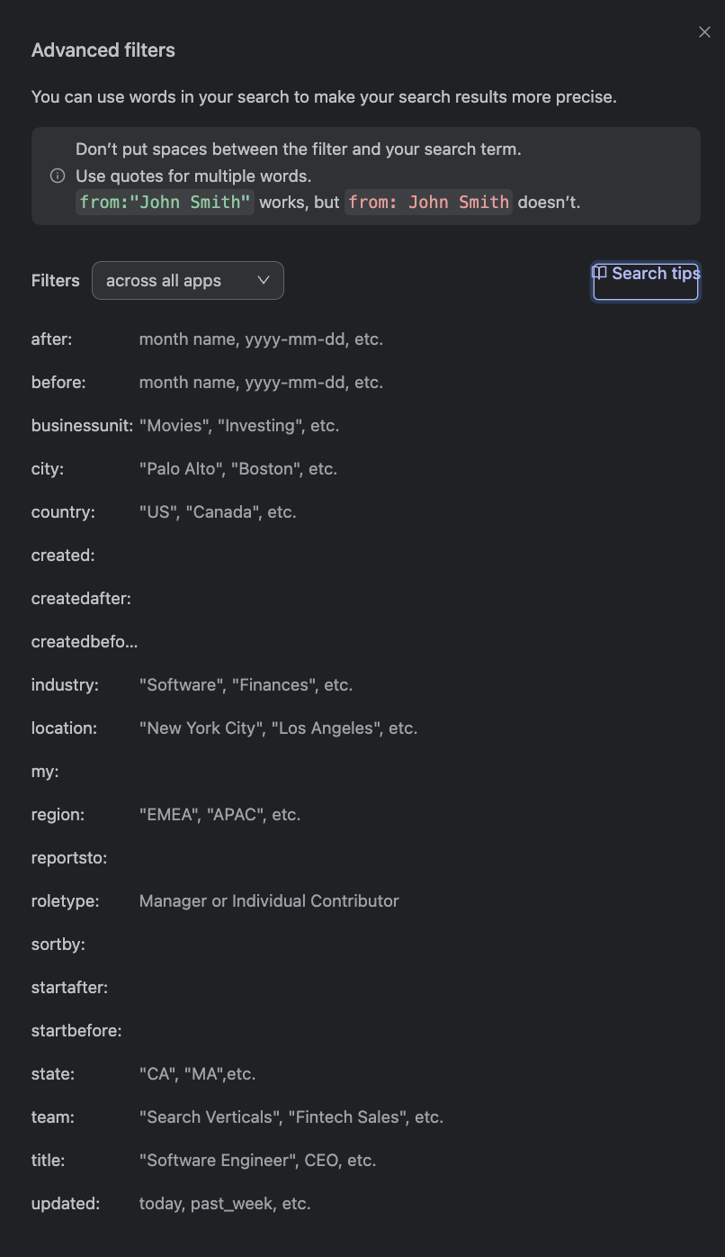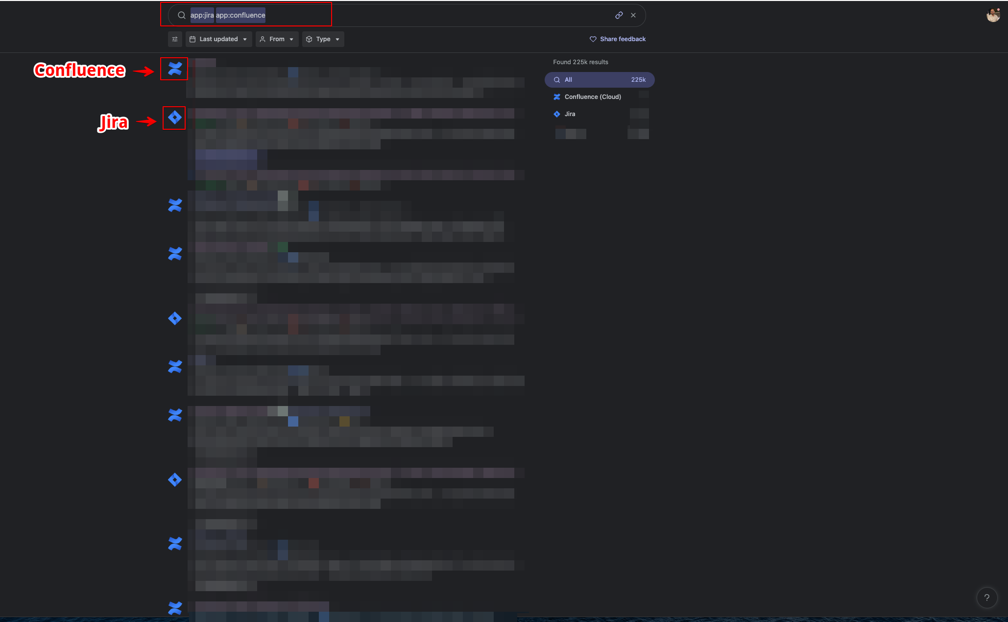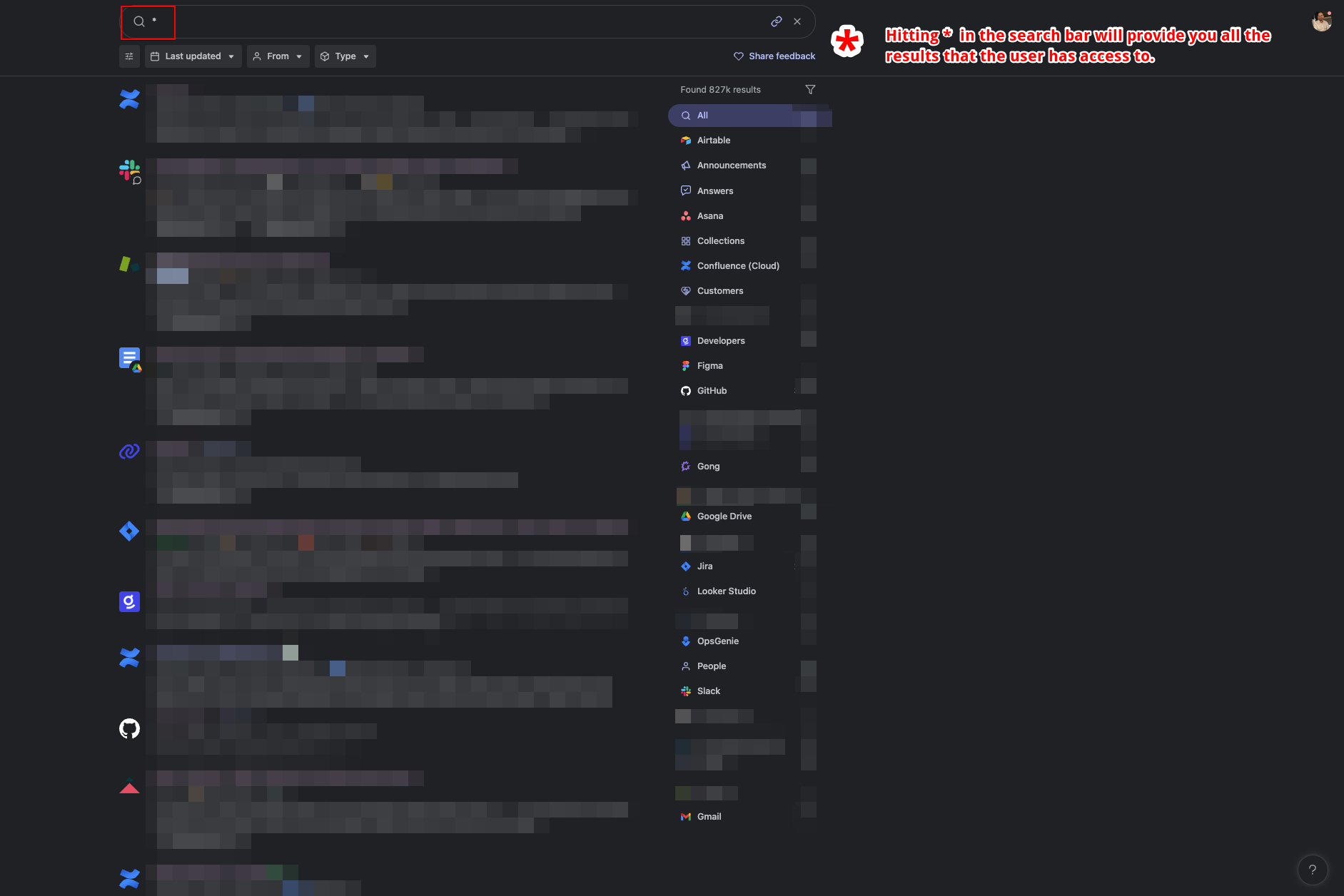 2. To search any document specific to a datasource then simply type "app:datasource_name" in the search bar, for example, "app:jira" or "app:salesforce".
