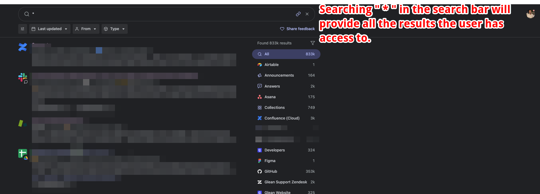 1. Searching * in the search bar provides all the results from the Super instances the user has access to. The results will be provided based on the connector.