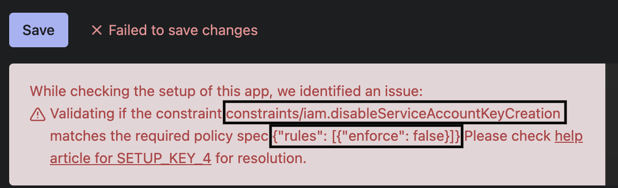 - From the error message on the validation page, note the constraint name and the required spec. From the example error message below, we can infer the constraint name to be constraints/iam.disableServiceAccountKeyCreation and the required policy spec to be {"rules":[{"enforce": false}]}