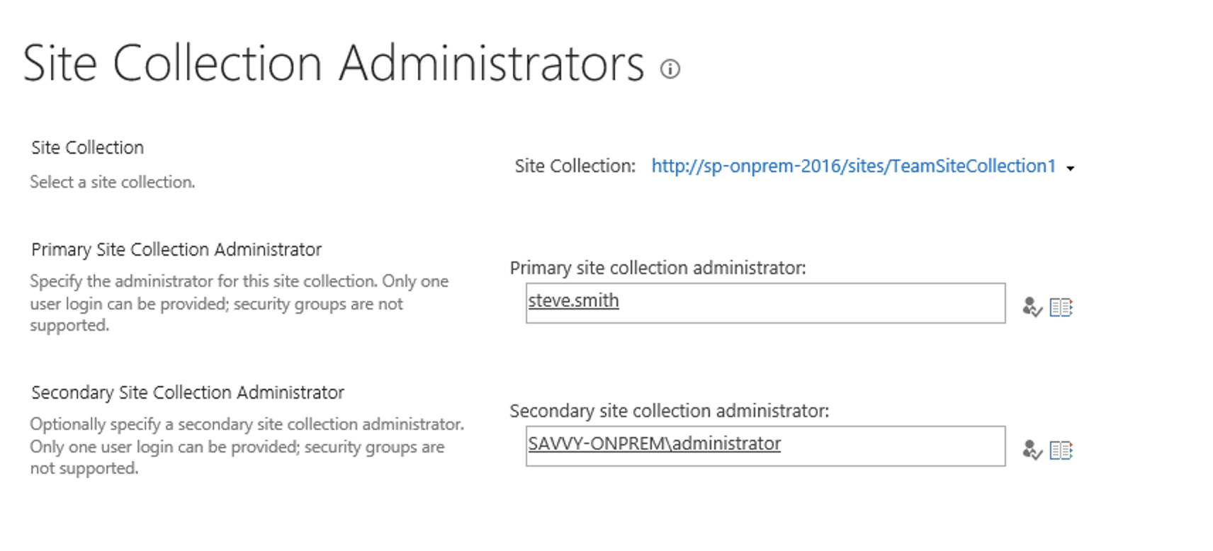 - Navigate to the owners page for the Sharepoint server: http://<domain>/_admin/owners.aspx. The page should look like the following (for domain sp-onprem-2016 and site collection /sites/TeamSiteCollection1)