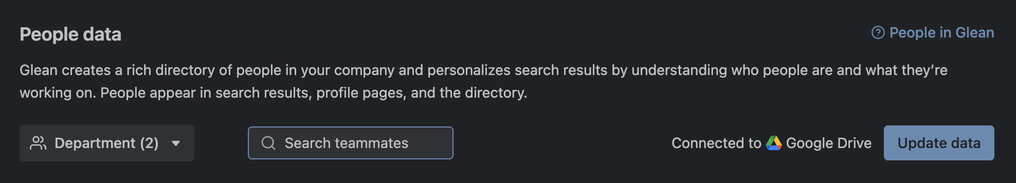 1. Identify the primary People datasource by navigating to Admin Workspace > Setup > People Data. Here you will find the People datasource. In the image below, we see that the People data is "Connected to Google Drive".